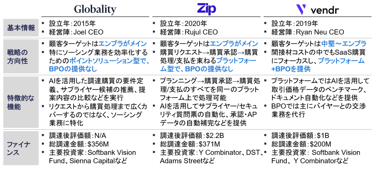投資検討では、競合企業や海外の先行プレイヤーの動向も重要な分析対象です。InProc社のケースでは、海外の先行プレイヤーがどのようにプロダクト機能を拡充し、事業の戦略的方向性を確立してきたのかを詳しく調べました。費目が多様で関連する部門も多岐にわたる間接材の最適化は、社内に蓄積された膨大なデータを学習できるAIエージェントと相性が良く、海外でも同様のアプローチでGlobality、Zip、Vendorなどの先行プレイヤーが出現しています。海外企業のリサーチでは、入手できる情報が限られる分、市場や事業の解像度を高め、投資検討に資する示唆を導き出すことに苦戦する場面が多々ありました。網羅的に情報をインプットしつつ、各社の差分に注目して、仮説ベースで調査を進めることを意識しました。