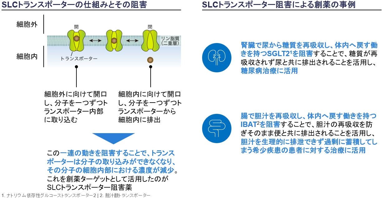 図1. SLCトランスポーター阻害薬の仕組みと事例