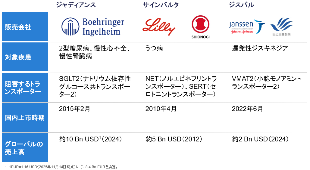 図2. 世界的に大きな売上高を記録したSLCトランスポーター阻害薬の事例