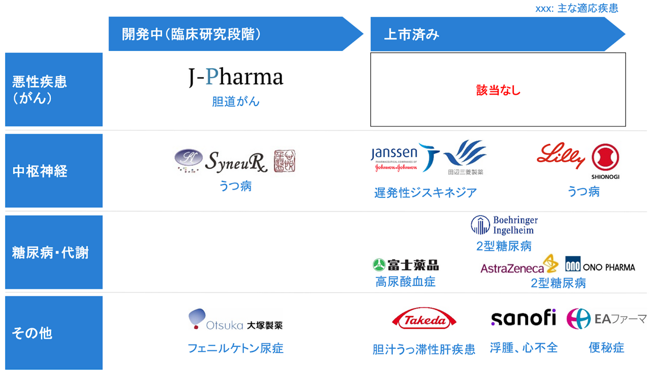 幅広い領域の疾患においてすでに上市済みあるいは開発が進んでいるSLCトランスポーター阻害薬ですが、がん領域においては上市済みの医薬品がなく、開発段階においてもAtransen社を除くと1社しか候補薬を持っていません。「がんに対するSLCトランスポーター阻害薬」は、革新性が高くアンメットニーズの強い領域であると言えます。