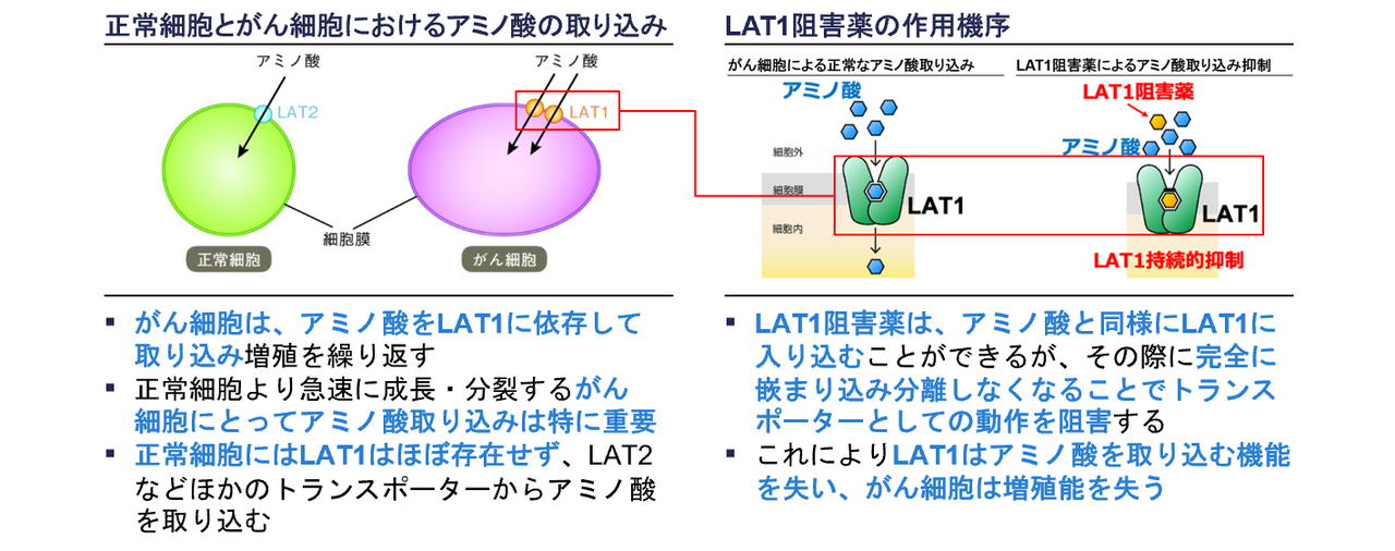 アミノ酸は、全ての細胞の生存・増殖に必須であり、細胞膜にあるトランスポーターで細胞内に取り込まれます。がん細胞は急速に増殖を繰り返すため特に多くのアミノ酸を取り込む必要があり、その役割を担うのががん細胞にのみ発現するLAT1です。LAT1阻害薬は、アミノ酸と同様にLAT1に入り込むことができますが、その際に嵌まり込んで分離しなくなってしまうことでLAT1の機能を阻害し、結果としてがん細胞は成長・分裂に必要なアミノ酸を取り込む機能を失い、成長の抑制や細胞死が生じます。なお、正常細胞にはLAT1がほぼ存在せず、異なるトランスポーターでアミノ酸を取り込んでいるため、LAT1阻害薬の影響は受けないことから副作用も生じにくいと考えられます。