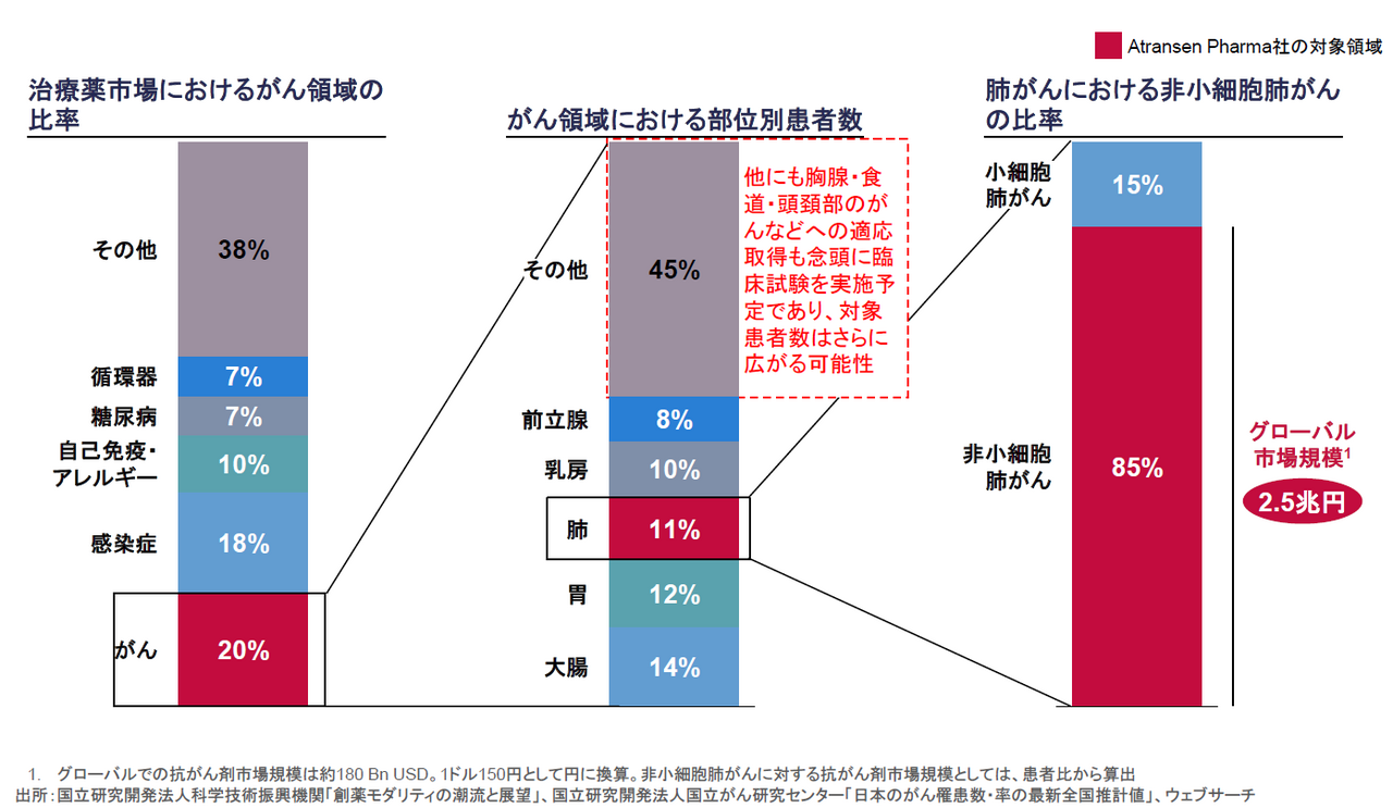 さらに、市場規模も重要な要素として考慮しました。がん治療薬は治療薬市場全体の中でも最も大きな市場ですが、Atransen社が適応獲得を目指す非小細胞肺がんはその中でも非常に患者さんが多く、グローバルの治療薬市場は2兆円を超える巨大市場です。市場規模としてはこれだけでも十分魅力的ですが、同社はさらに他の複数のがんに対する適応獲得を目指して臨床試験の準備を進めており、対象市場はさらに大きくなると予測されます。