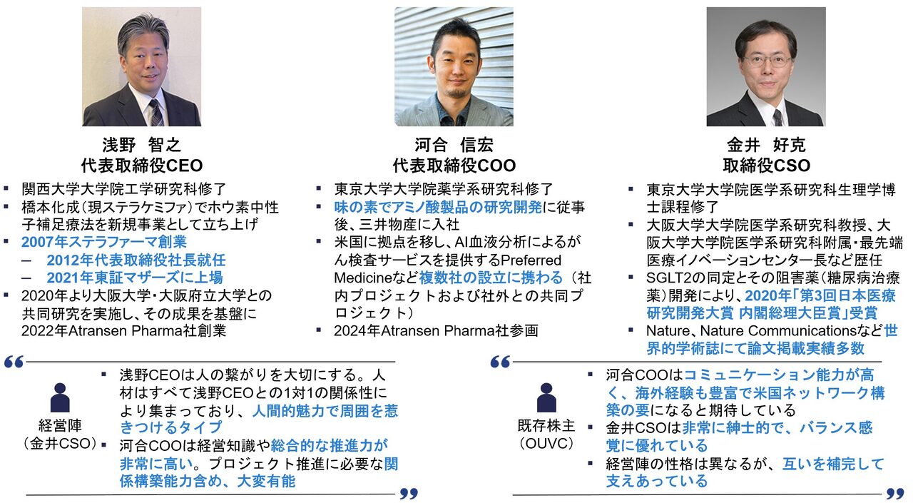 Atransen社の基盤には、サイエンスと事業を両面でバランス良く推進できる優秀な経営陣の存在があります。