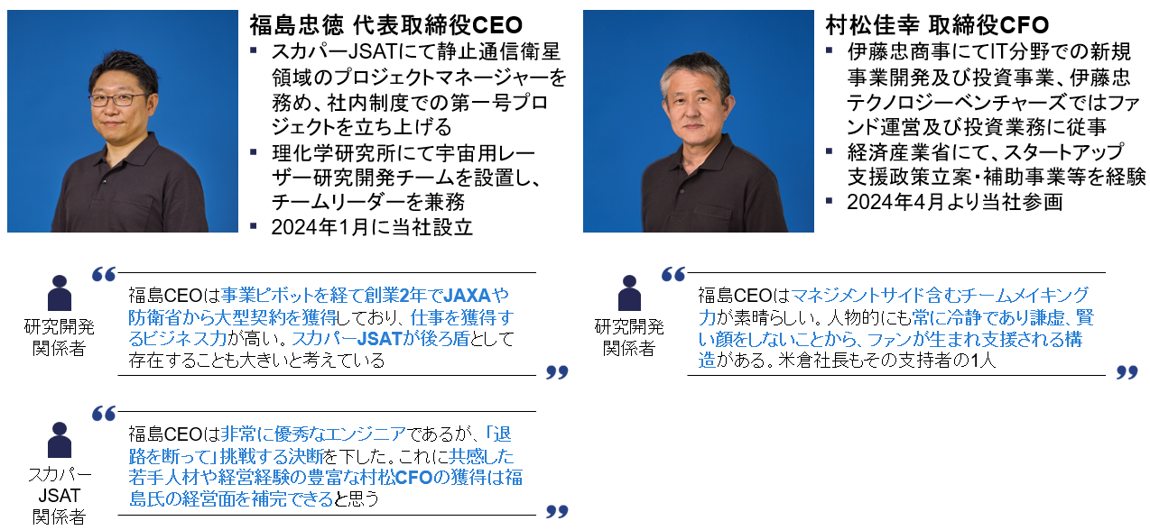 Orbital Lasers社の魅力は、技術やトラクションのみではありません。難易度の高い宇宙ビジネスの領域においては、技術を理解しつつ、ビジネスとして成立させる経営人材の存在は大きな検討事項でした。