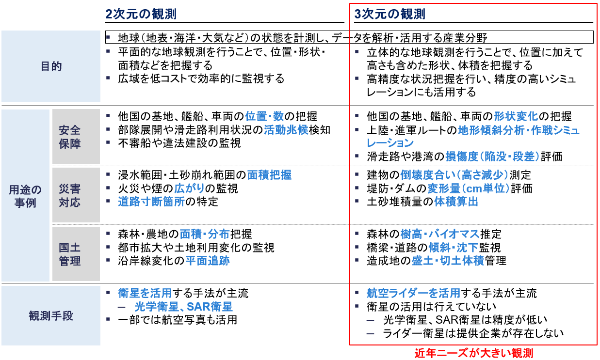 一方で近年、必要とされる情報は、位置や面積といった平面的な把握にとどまらず、より定量的な3次元情報へと広がっています。災害対応であれば、土砂移動量(体積)や堤防・ダム・道路などの変形量が、復旧判断や優先順位に直結します。安全保障用途でも、重要インフラの損傷度や地形の傾斜など、高さ・傾斜・体積といった3次元の定量情報が必要となる場面が増えています。結果として地球観測は、「2次元で状況を見える化する」だけでなく、「3次元情報に基づき判断できる状態」を求められるフェーズに移行しつつあります。