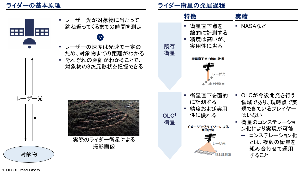 そこで注目されている手法が、宇宙から3次元データを取得する衛星ライダーです。レーザーの送受信により距離を計測し、地形や構造物の3次元形状を取得します。将来的には、より広域(面)での計測や、衛星コンステレーション*による高頻度観測を実現することで、データ・プロダクト販売まで含めた事業展開が企図され、ハードウェア単体ではなくデータビジネスとしての拡張余地も有しています。