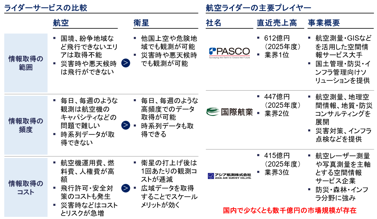 現時点で3次元データ取得の主流は、航空ライダーです。高精度の3次元データが得られるため、測量やインフラ点検などで広く活用されてきました。実際に主要プレイヤー各社は航空ライダーを主な事業として数百億円の売上を出しています。一方で航空ライダーは飛行計画・許認可・安全確保など運用の制約が大きく、広域を高頻度で巡回する用途や、災害直後・危険地域での迅速な情報取得には限界が出やすいという課題があります。