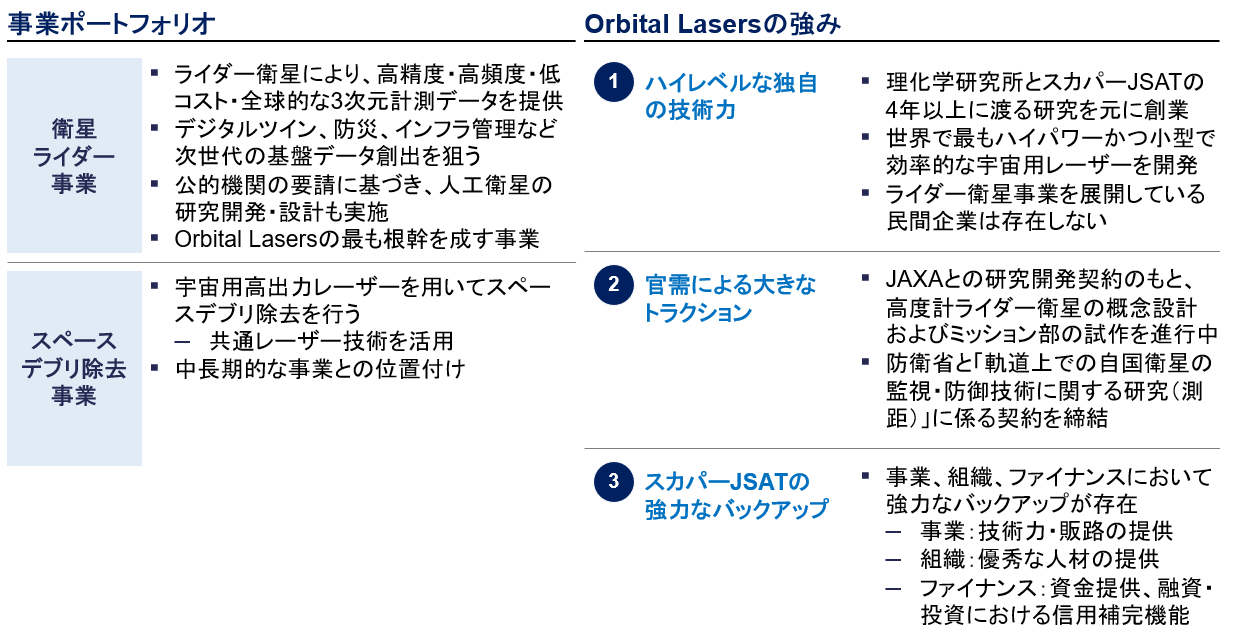 Orbital Lasers社は、世界最高レベルのレーザー研究を行う理化学研究所とスカパーJSATによる共同研究と、それを事業化すべく邁進された福島CEOの熱量によって生まれた、世界最高水準の「高出力・小型・高効率」を実現する宇宙用レーザー技術の開発に取り組むスタートアップスタートアップです。理化学研究所は、米国SLAC、欧州ELI、ドイツDESYなどと並ぶ世界最高レベルの研究基盤を有し、レーザー研究においても世界トップクラスと位置付けられています。Orbital Lasers社は宇宙用レーザーを核に、衛星ライダー事業とスペースデブリ除去事業の2つの事業を展開しています。